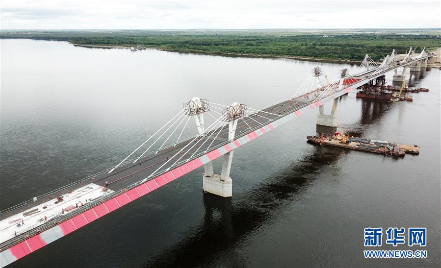 正在進(jìn)行橋面鋪裝施工作業(yè)的黑河到布拉戈維申斯克黑龍江(阿穆爾河)大橋(8月19日無(wú)人機(jī)拍攝)。新華社記者 王建威 攝