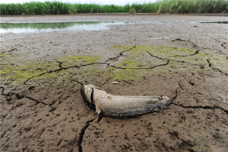 2011年9月21日,江西鄱陽(yáng)湖,一條沒(méi)來(lái)及逃離的魚干死在河床上。