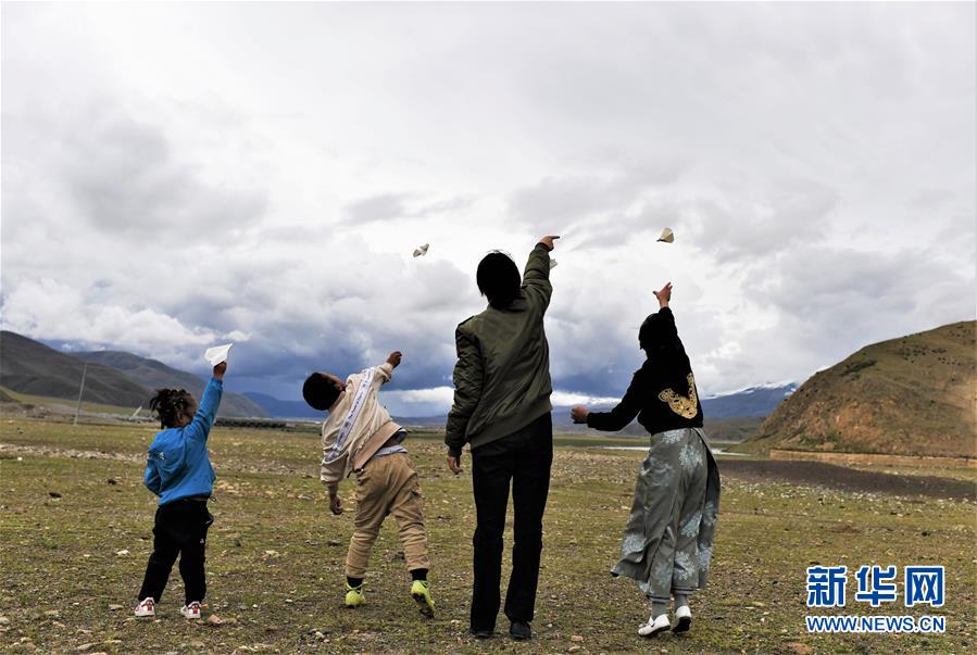 堅熱益西(右二)在牧區(qū)和弟弟妹妹一起放飛紙飛機(jī)(7月13日攝)。新華社記者普布扎西攝