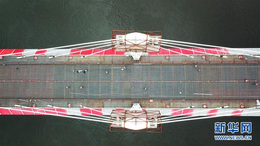 正在進(jìn)行橋面鋪裝施工作業(yè)的黑河到布拉戈維申斯克黑龍江(阿穆?tīng)柡樱┐髽颍?月19日無(wú)人機(jī)拍攝)。新華社記者王建威攝