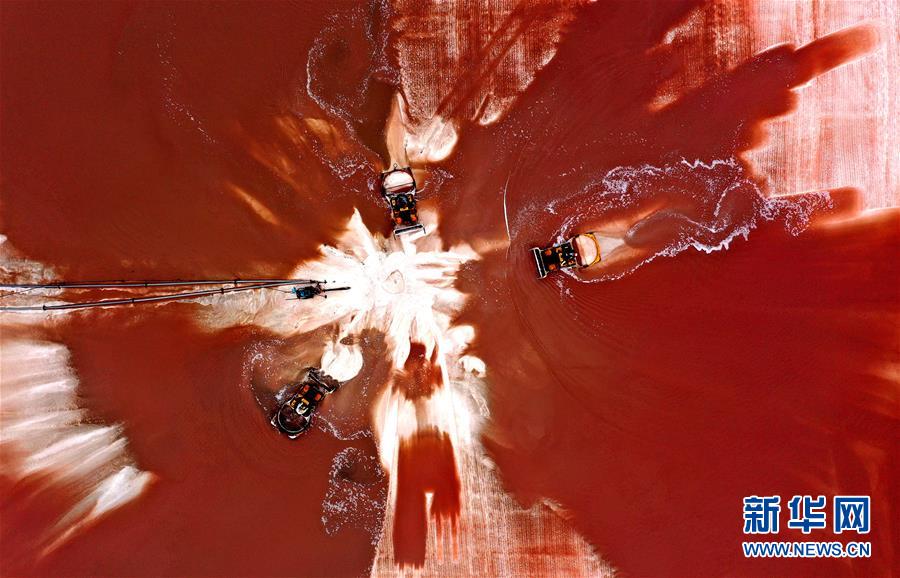 魯北鹽場工人在鹽池中收獲海鹽(10月9日無人機(jī)拍攝)。新華社記者 朱崢 攝