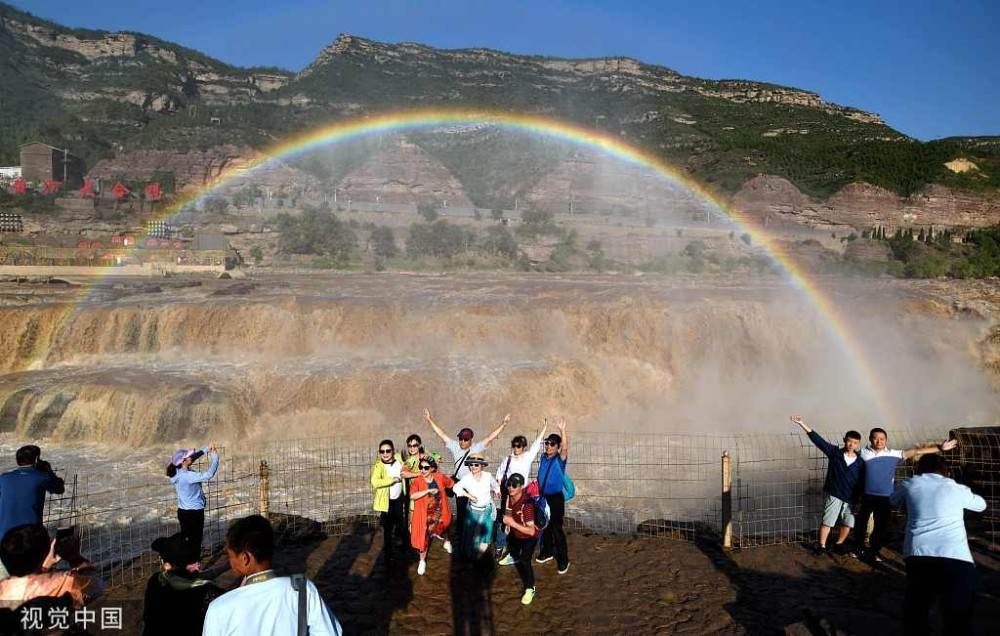 2019年8月17日,山西臨汾,游客在吉縣黃河壺口瀑布欣賞“彩虹門(mén)”景觀。
