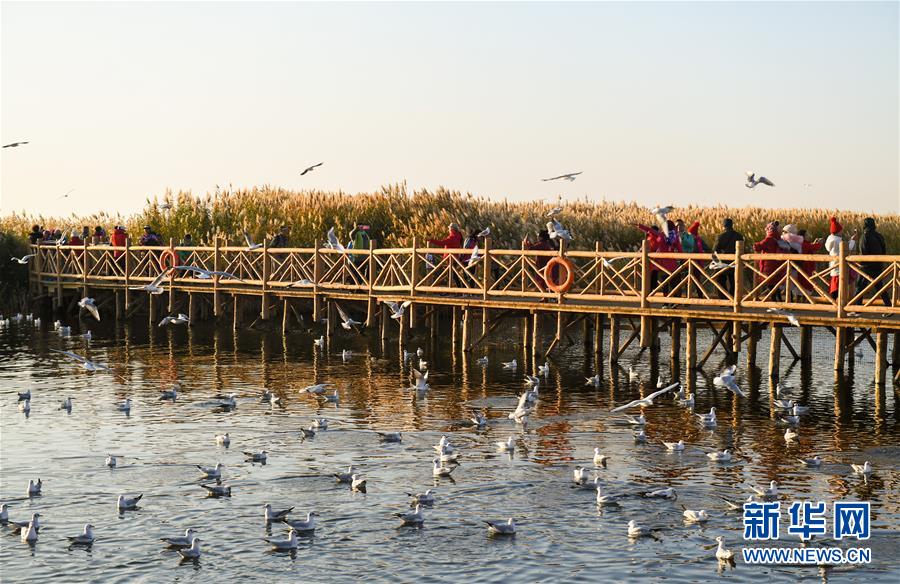 10月17日,游客在居延海岸邊的木棧道上給水鳥喂食。 新華社記者 彭源 攝