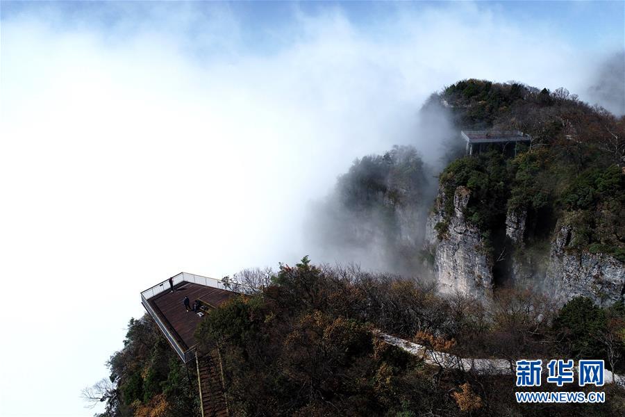 10月17日,游客在漢中市南鄭區(qū)龍頭山風(fēng)景區(qū)拍照。 陜西省漢中市南鄭區(qū)龍頭山風(fēng)景區(qū)位于川陜交界處米倉山主梁。龍頭山景區(qū)常年云霧繚繞,宛如仙境,還有奇石、云海、彩林、霧凇等景觀令游客流連忘返。 新華社記者 張博文 攝