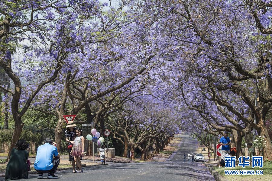 10月20日,在南非比勒陀利亞,游人在藍花楹樹下拍照。新華社記者陳誠攝