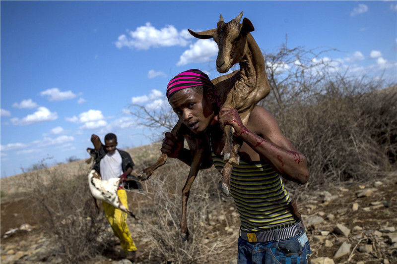 當(dāng)?shù)貢r(shí)間2016年12月15日,索馬里邦特蘭,干旱的土地上散布著羊的尸體。當(dāng)?shù)卦庥龈珊堤鞖猓笫艿轿:Α?/p>
