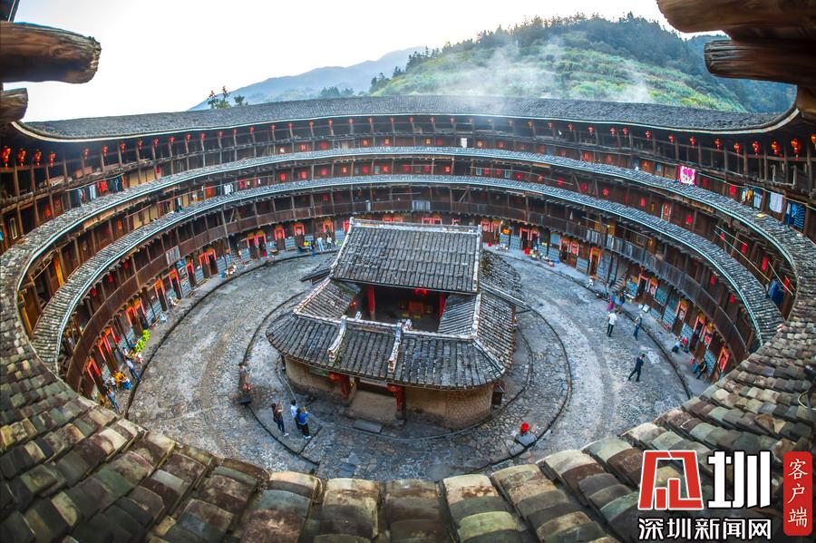 高5層18.2米、每層54間是共有房270間,占地是2289平方米,建筑面積是6358.2平方米,土木結(jié)構(gòu)是通廊式圓樓;第一層墻厚是1.8米,往上逐層減縮了10厘米。