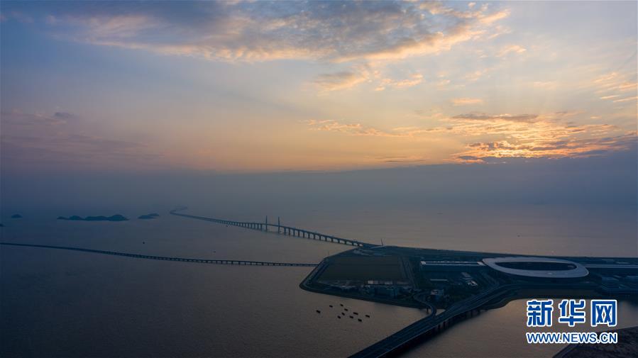 晨曦中的港珠澳大橋珠澳口岸人工島(10月24日無人機拍攝)。2018年10月23日,港珠澳大橋正式開通。在這座圓夢橋、同心橋、自信橋、復興橋開通一周年之際,記者親自體驗“一橋連三地、一日游三城”的悠閑與便利,于不同的旖旎風光中自在游覽,在不同的城市風貌間自如切換。新華社記者張金加攝