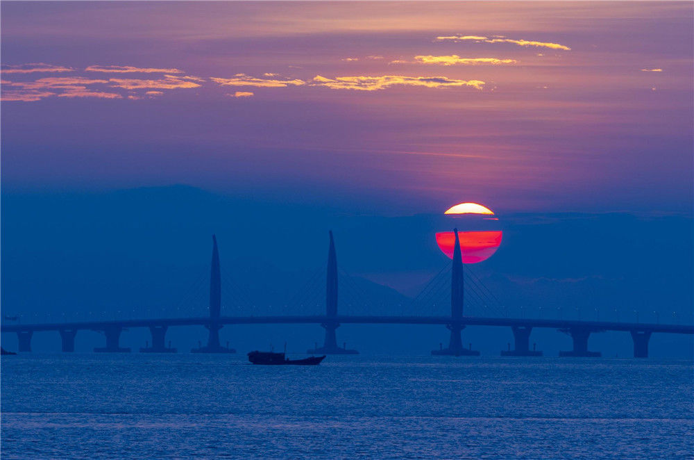 2018年10月22日早晨,從廣東珠海市的情侶路向東眺望,一輪紅日從東方冉冉升起,將港珠澳大橋映射得格外迷人。“超級(jí)工程”港珠澳大橋?qū)⒂?4日上午9時(shí)正式通車。張煒(香港分社)/中新社/視覺中國(guó)