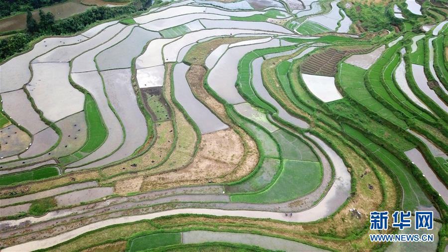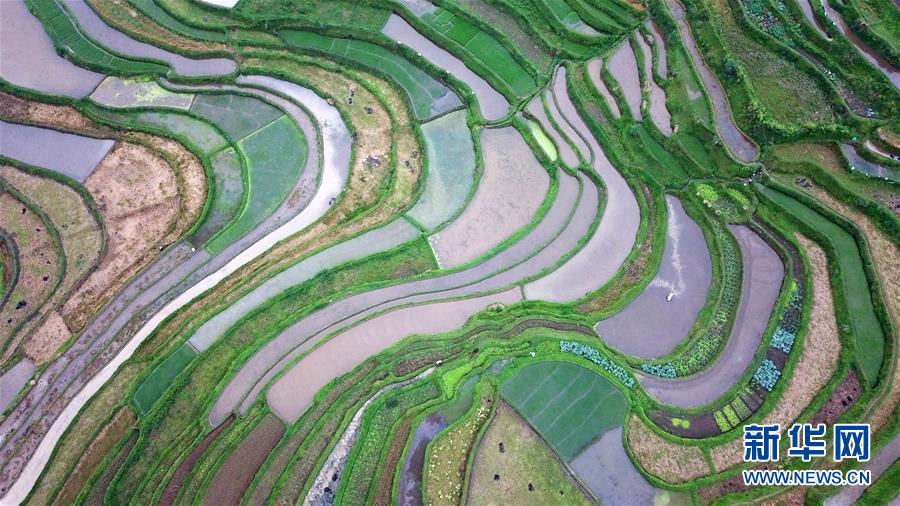 5月18日,農(nóng)民在貴州省丹寨縣龍泉鎮(zhèn)高要梯田里耕作(無(wú)人機(jī)拍攝)。初夏時(shí)節(jié),位于貴州省丹寨縣龍泉鎮(zhèn)的高要梯田景色優(yōu)美。新華社記者楊文斌攝