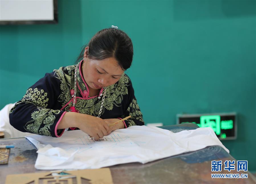 7月2日,苗族婦女王尖其在丹寨萬(wàn)達(dá)小鎮(zhèn)展示苗族蠟染技藝。新華社記者歐東衢攝