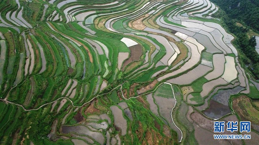 這是5月18日無(wú)人機(jī)拍攝的貴州省丹寨縣龍泉鎮(zhèn)高要梯田景色。初夏時(shí)節(jié),位于貴州省丹寨縣龍泉鎮(zhèn)的高要梯田景色優(yōu)美。新華社記者楊文斌攝