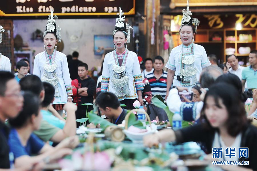 當(dāng)日,貴州省黔東南苗族侗族自治州丹寨縣迎來(lái)苗族傳統(tǒng)節(jié)日“吃新節(jié)”,游客與苗族同胞在萬(wàn)達(dá)小鎮(zhèn)參加“萬(wàn)人長(zhǎng)桌宴”,歡度節(jié)日,慶祝豐收。