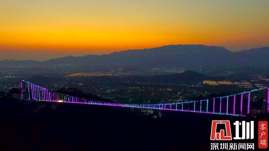 2018年10月7日,廣東佛山。網(wǎng)友紛紛稱佛山南丹山玻璃橋是廣東最美玻璃橋。漸漸地,金燦燦的陽光變?yōu)榱顺赛S色,開始變得柔和,嫵媚動人,給美麗恬靜的群山抹上一層金光。太陽開始脫去華麗的金絲紗裙,換上了橘黃色的時(shí)尚。玻璃橋也穿上了端莊典雅的晚禮服,露出那像蒙娜麗莎一樣迷人的笑容。