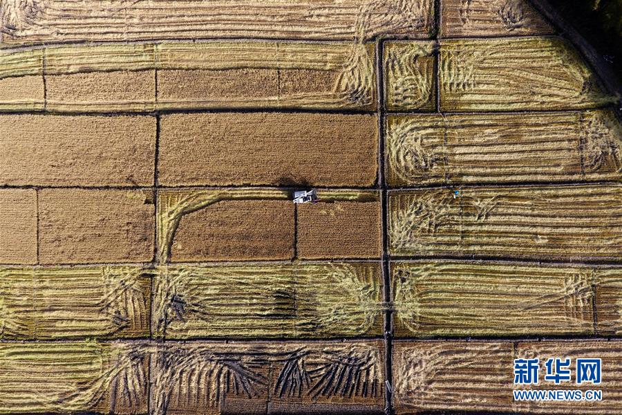 在太原市晉源區(qū)赤橋村,收割機在稻田里作業(yè)(10月28日無人機拍攝)。