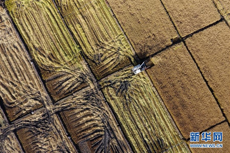 收割機(jī)在太原市晉源區(qū)赤橋村稻田里作業(yè)(10月28日無(wú)人機(jī)拍攝)。新華社記者詹彥攝