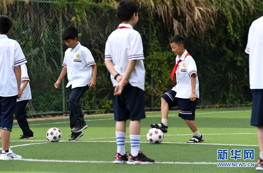 9月3日,金寨縣希望小學學生在足球課上訓練。新華社記者張端攝