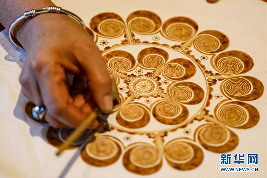 10月29日,楊芳在位于丹寨萬達(dá)小鎮(zhèn)內(nèi)的工作室內(nèi)繪制蠟染圖案。新華社記者 歐東衢 攝