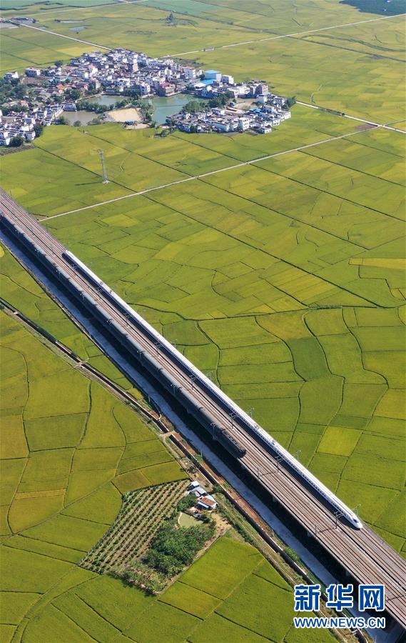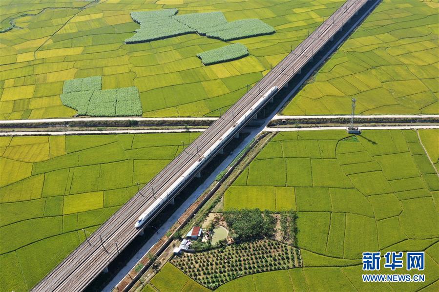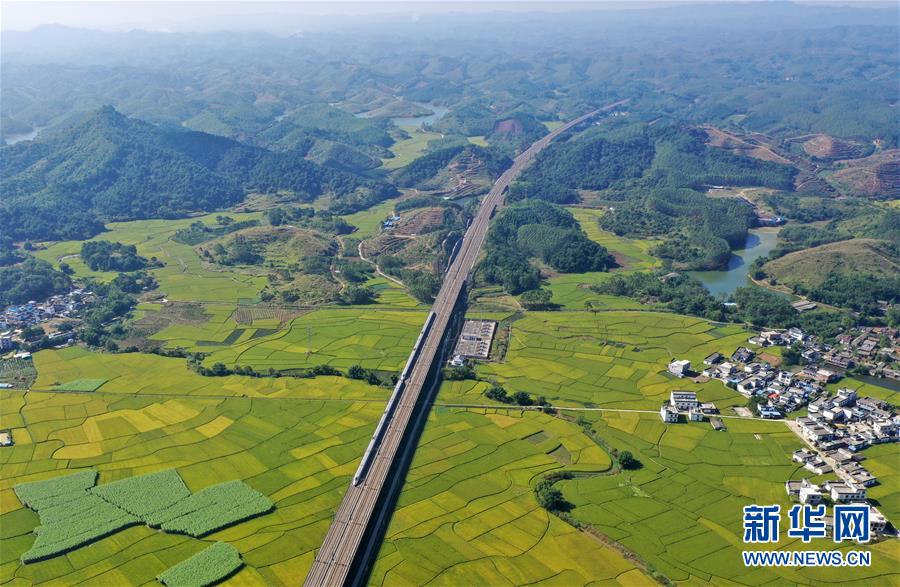 眼下,廣西賓陽縣古辣鎮(zhèn)大面積稻田進入收獲期,一列列南來北往的動車從稻田間飛馳而過,構成一幅幅美麗的豐收圖畫。