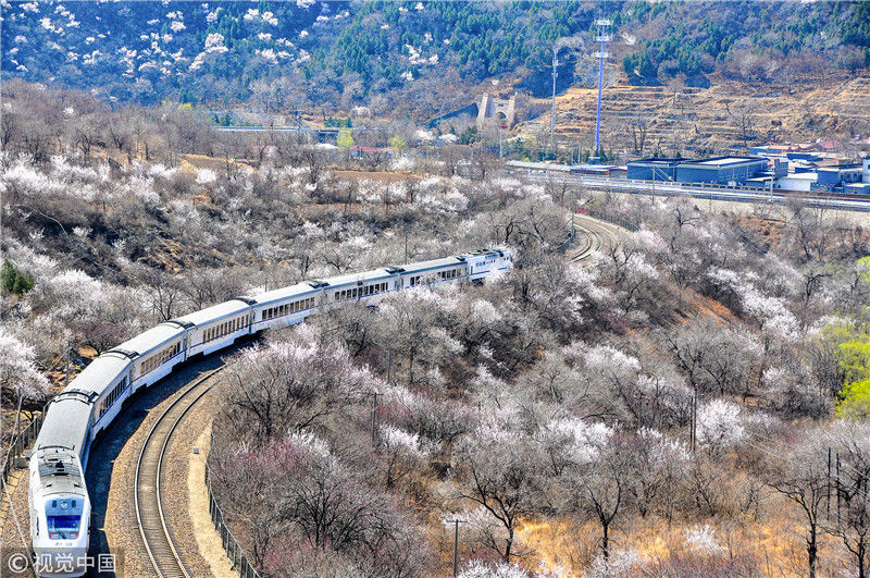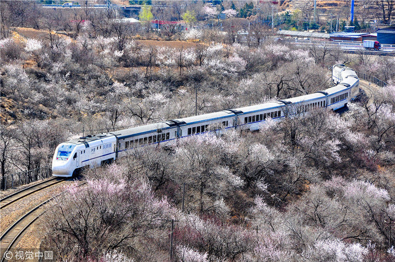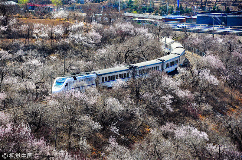 2019年3月22日,北京居庸關附近的山花盛開,S2線列車穿行在花海之中,構成一幅美麗的畫面。時永平/千龍圖像/視覺中國編輯/陳進