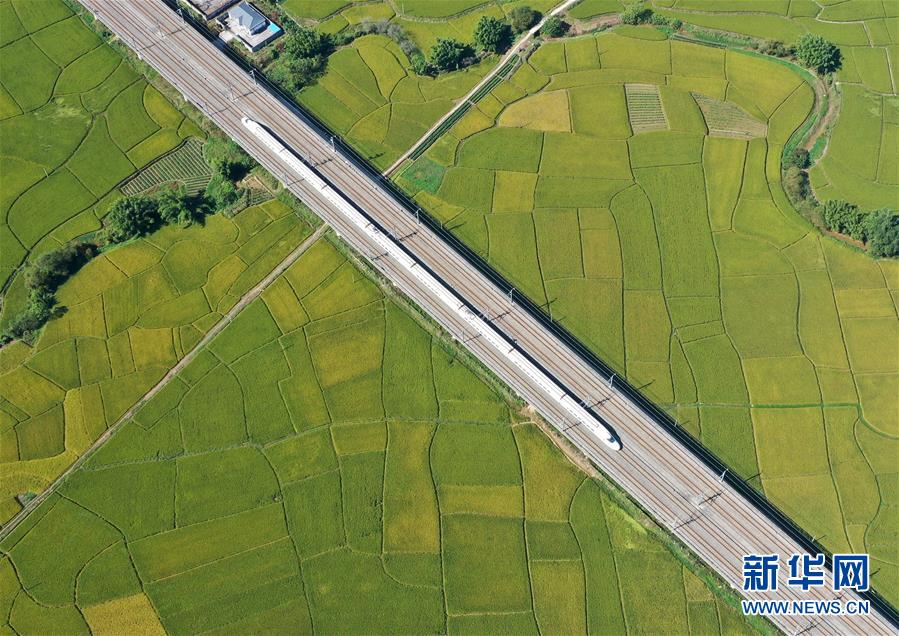 10月29日,列車從廣西賓陽縣古辣鎮(zhèn)豐收的稻田間駛過(無人機拍攝)。新華社記者陸波岸攝