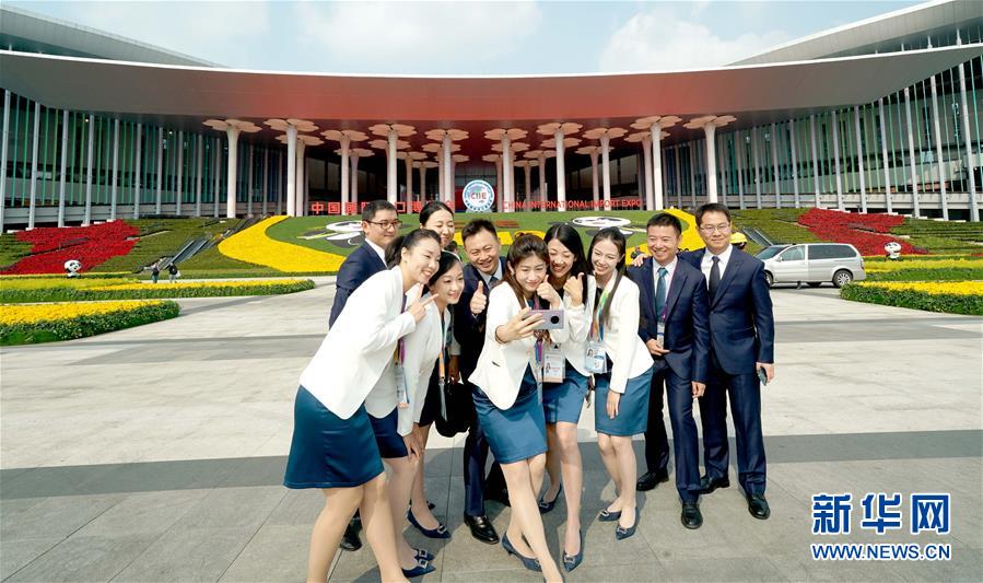 11月4日,第二屆中國國際進(jìn)口博覽會中國館的工作人員在國家會展中心(上海)南廣場合影。新華社記者 陳建力 攝