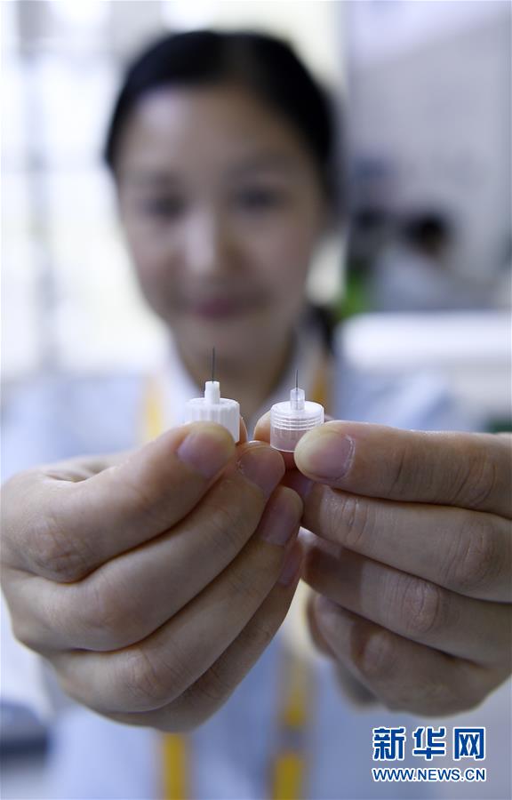 在第二屆進博會醫(yī)療器械及醫(yī)藥保健展區(qū),工作人員展示全球最細胰島素注射針頭“納諾斯Jr.”(右)與普通針頭的對比(11月7日攝)。新華社記者王鵬攝