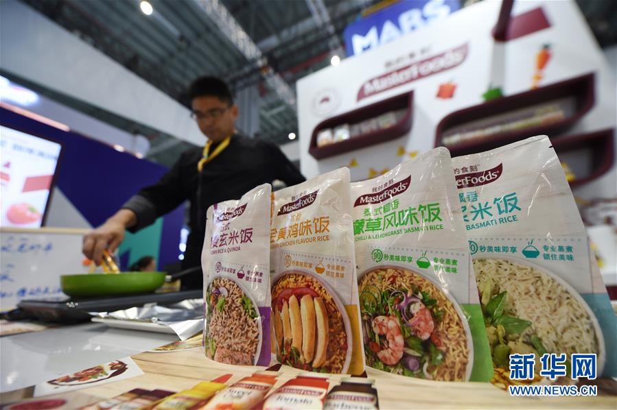 這是在第二屆進(jìn)博會瑪氏公司展臺拍攝的“我的食刻”方便米飯產(chǎn)品(11月7日攝)。新華社記者尹炣攝