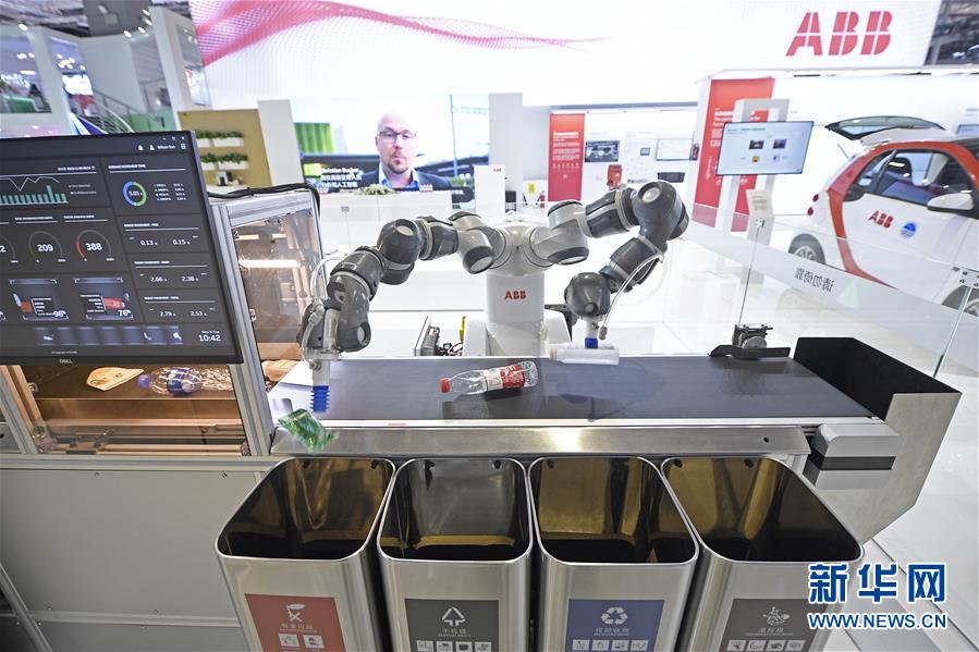 第二屆進博會瑞士ABB集團展出的人機協(xié)作雙臂機器人YuMi在進行垃圾分類演示(11月5日攝)。新華社記者王鵬攝
