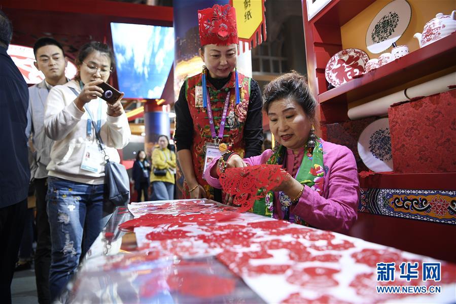 非遺傳承人田亞莉(右一)在第二屆進博會陜西非遺展區(qū)展示剪紙技藝(11月8日攝)。新華社記者王鵬攝