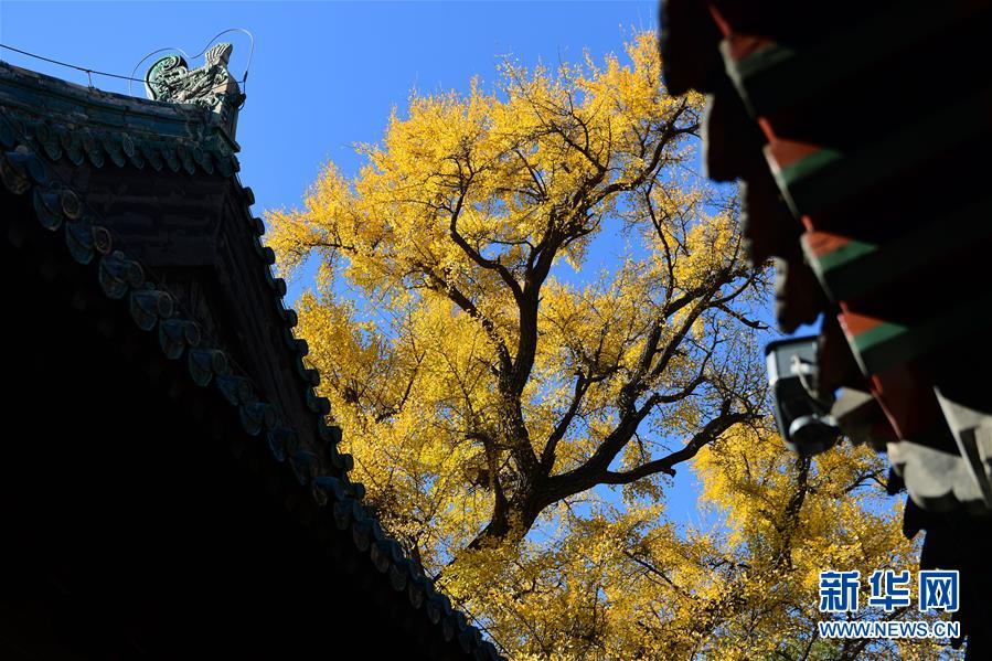 11月11日,大覺(jué)寺內(nèi)的古銀杏與建筑相映成趣。新華社記者尹棟遜攝