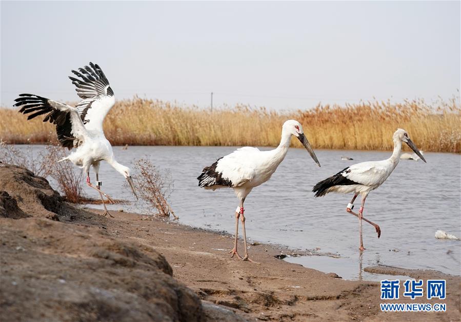 這是在樂(lè)亭縣野生動(dòng)物保護(hù)協(xié)會(huì)大清河鳥(niǎo)類救助站放飛回歸大自然的三只國(guó)家一級(jí)保護(hù)動(dòng)物東方白鸛(11月16日攝)。新華社記者楊世堯攝