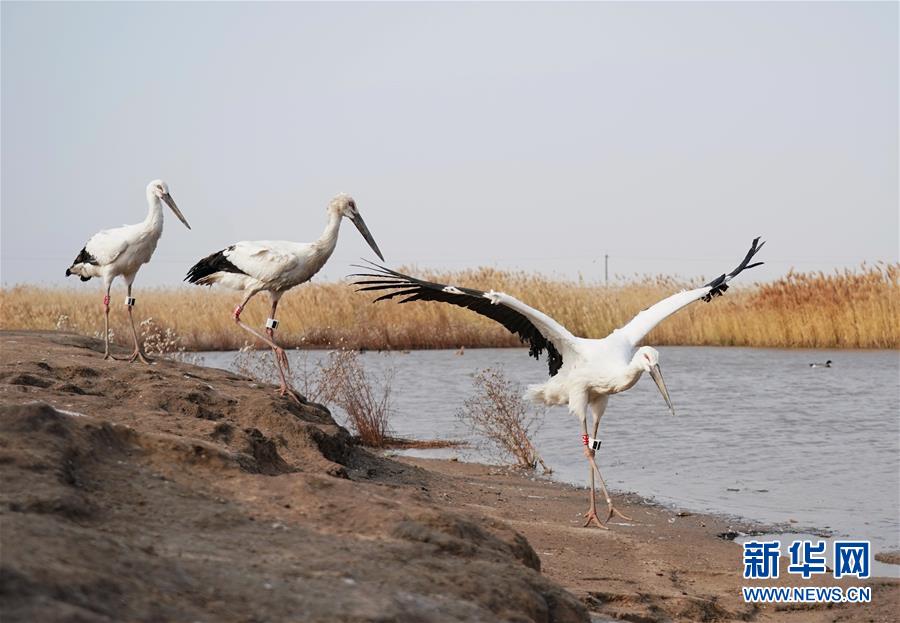 這是在樂(lè)亭縣野生動(dòng)物保護(hù)協(xié)會(huì)大清河鳥(niǎo)類救助站放飛回歸大自然的三只國(guó)家一級(jí)保護(hù)動(dòng)物東方白鸛(11月16日攝)。新華社記者楊世堯攝