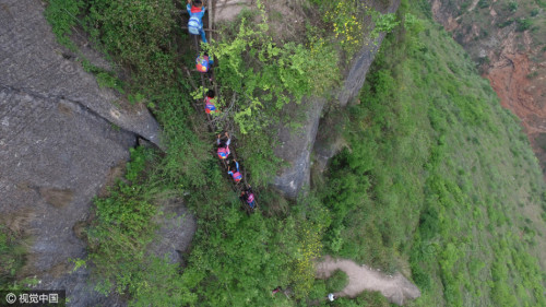 4月27日,阿土勒爾村的一個村民摔下了懸崖,村子里的大人對在山下讀書的孩子更加擔心起來。阿土勒爾村有15個6至15歲的孩子在山腳下的勒爾小學上學,平時住校,每月月中和月底的周末才回家。每次上下山,家長們都會輪流接送。圖片來源:視覺中國