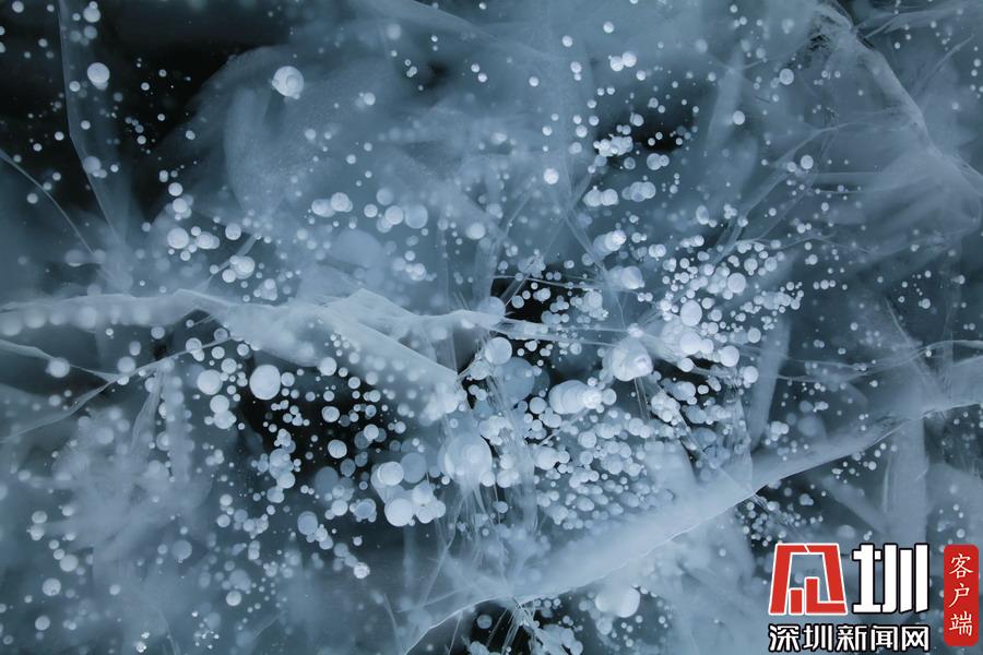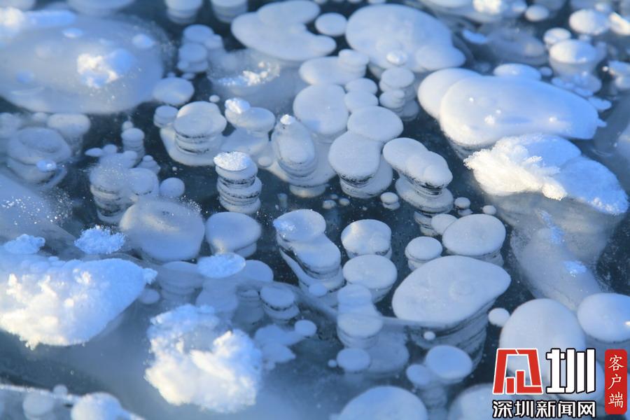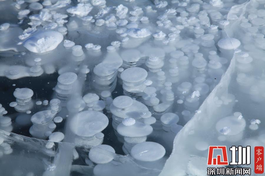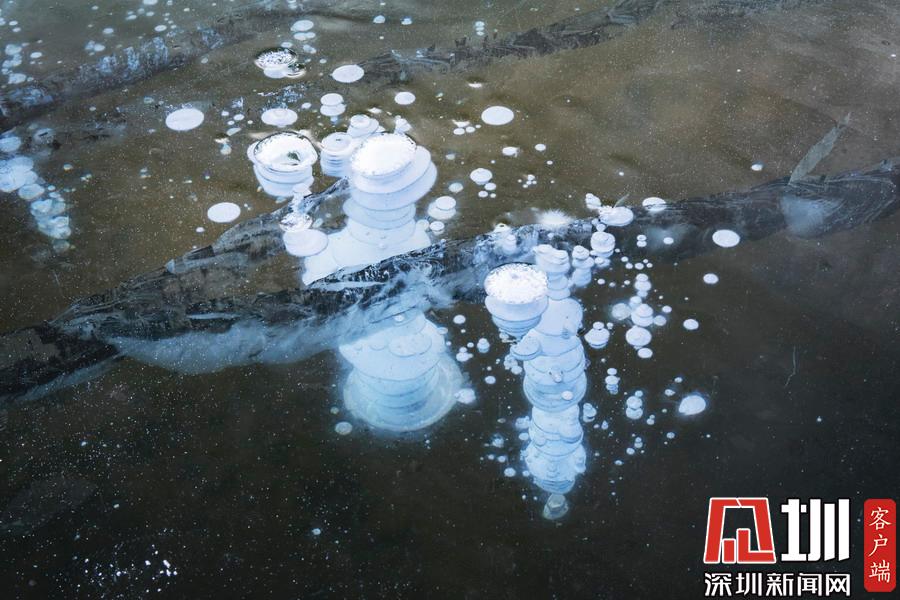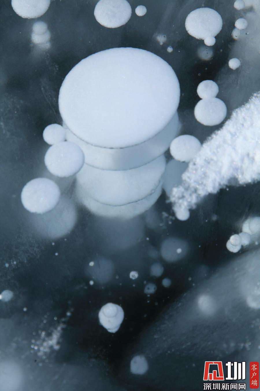透過晶瑩剔透的冰面,可以看到一串串潔白氣泡分布在冰層中。