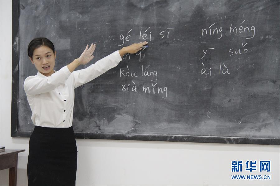 11月18日,在多哥首都洛美,中國老師文盼在第一堂中文課上講習拼音。新華社記者肖玖陽攝