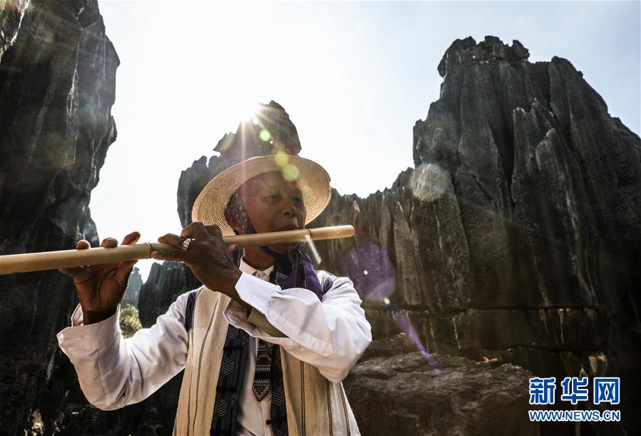 當(dāng)?shù)厣贁?shù)民族樂手在石林景區(qū)演奏民族音樂(11月27日攝)。新華社記者蘭紅光攝