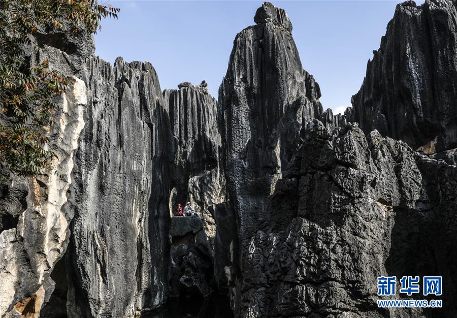 當?shù)厣贁?shù)民族樂手在石林景區(qū)演奏民族音樂(11月27日攝)。新華社記者蘭紅光攝