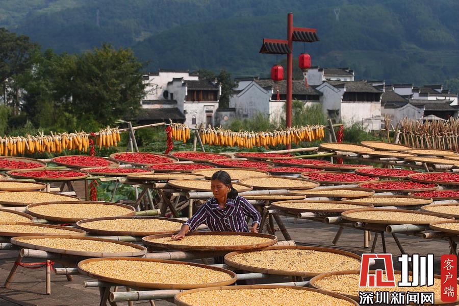 當日立秋節(jié)氣,江西婺源縣篁嶺古村的農作物普遍豐收,村民們又迎來了一年一度的“曬秋”季。