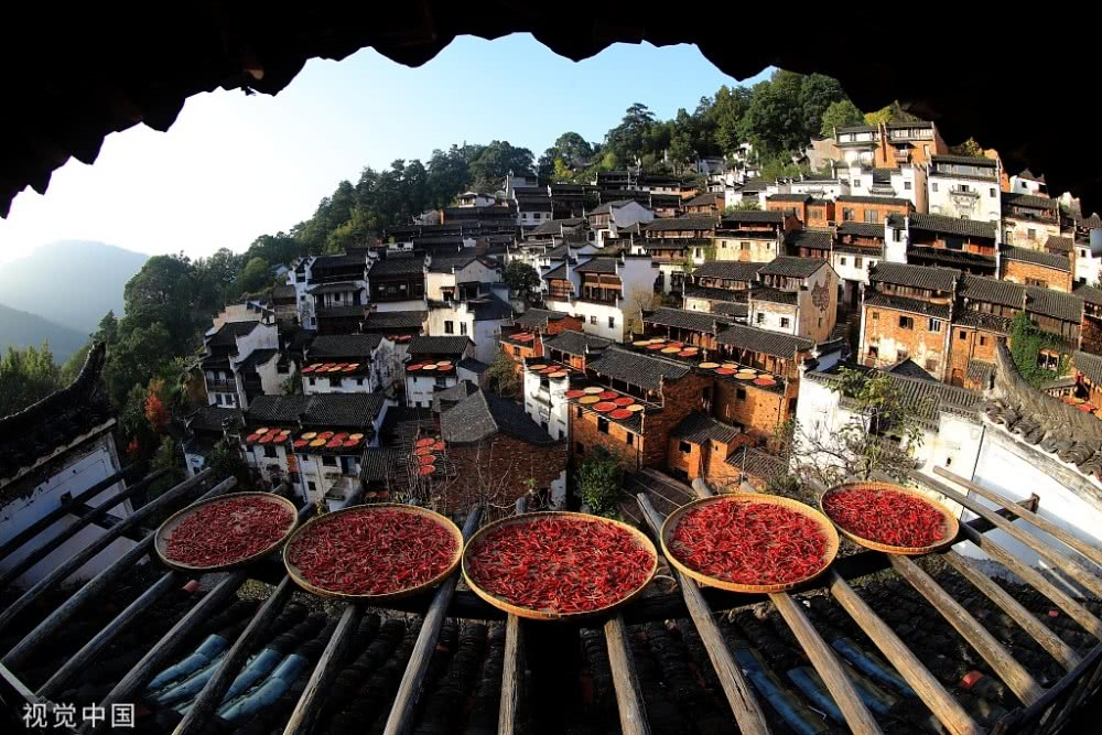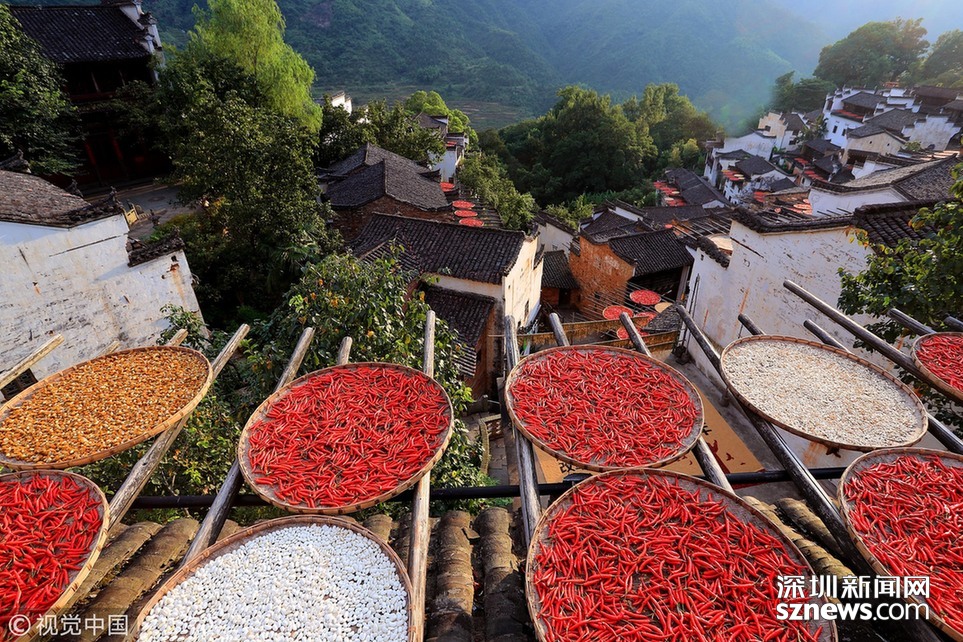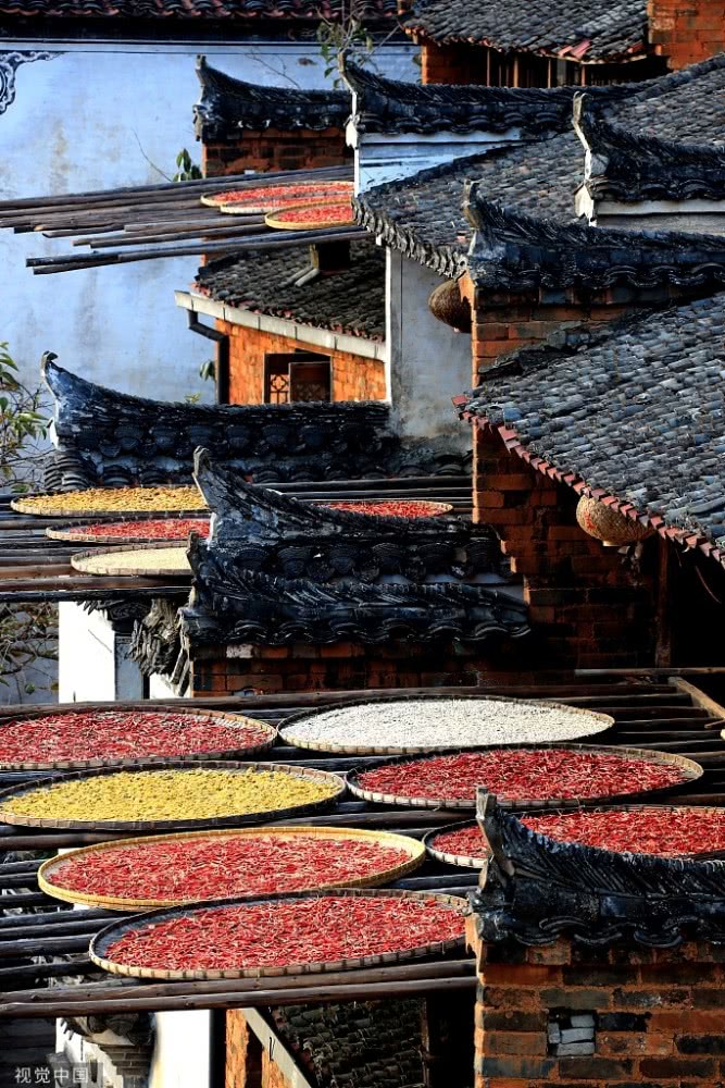 色彩斑斕的圓圓的曬匾,與依山而建的徽派古民居交相輝映,炫彩奪目。