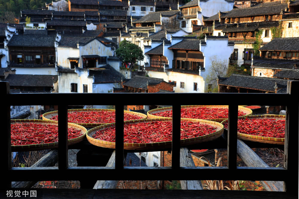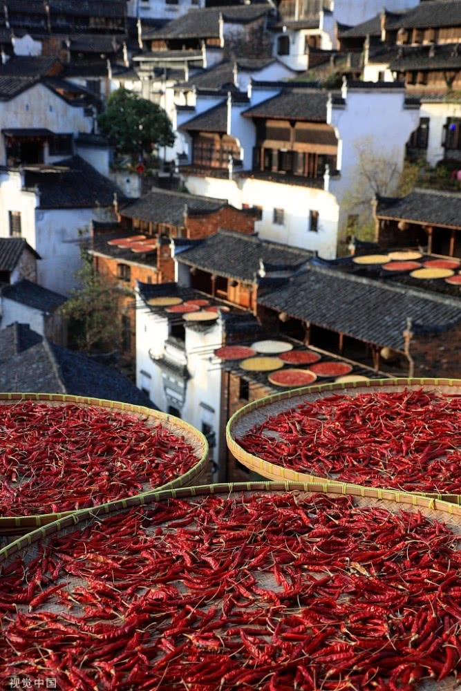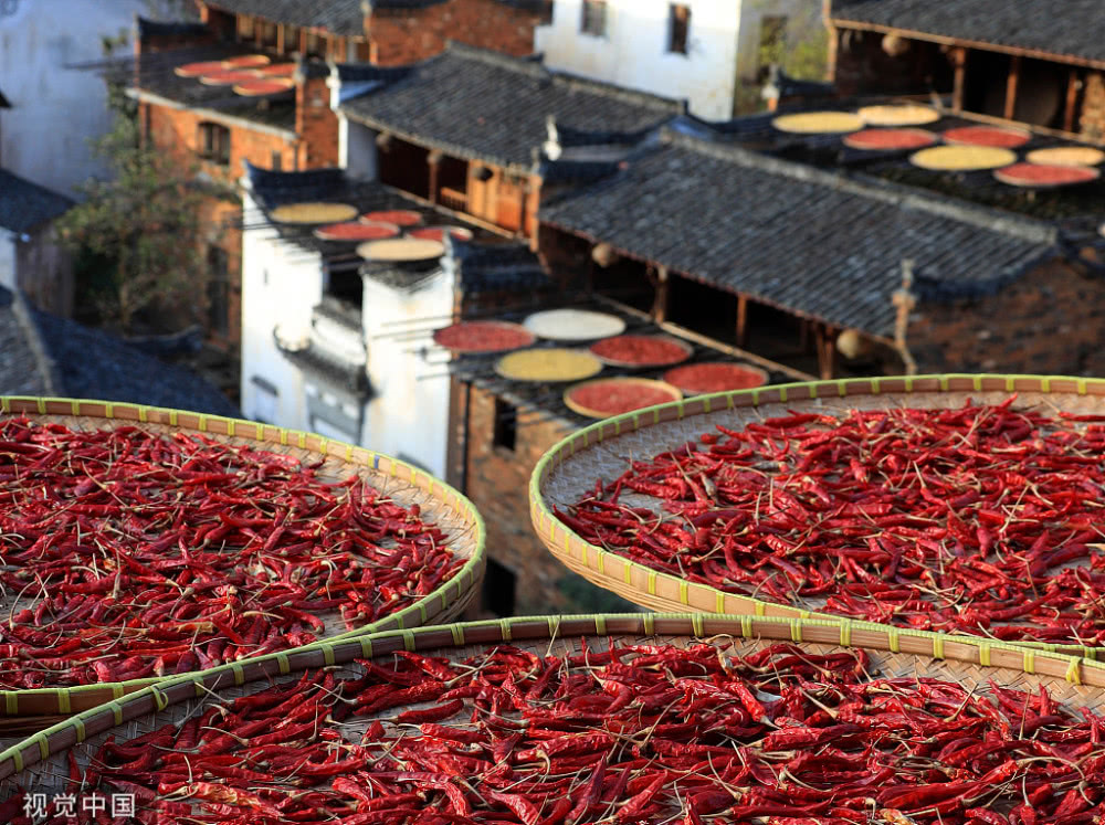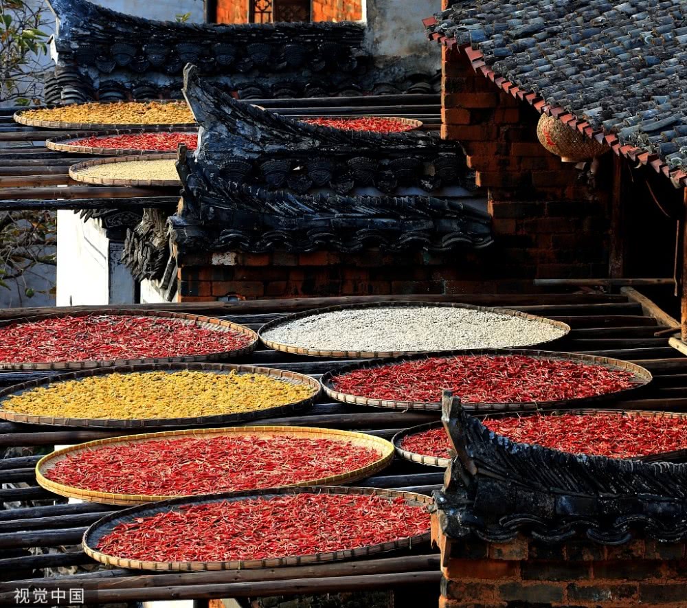 2018年8月7日,江西婺源縣篁嶺古村落,壯觀“曬秋”場景。當日立秋節(jié)氣,江西婺源縣篁嶺古村的農作物普遍豐收,村民們又迎來了一年一度的“曬秋”季。村民們將收獲來的紅辣椒、玉米、南瓜、稻谷和菊花等色彩斑斕的農作物,晾曬在依山而建的徽派民居房前屋后的木制曬架上,在秋日陽光的照射下,色彩繽紛圓圓的曬扁,鋪就在錯落有致的徽派民居之間,格外璀璨奪目,蔚為壯觀。目前,“篁嶺曬秋”已經成為中國鄉(xiāng)村旅游的一張名片。