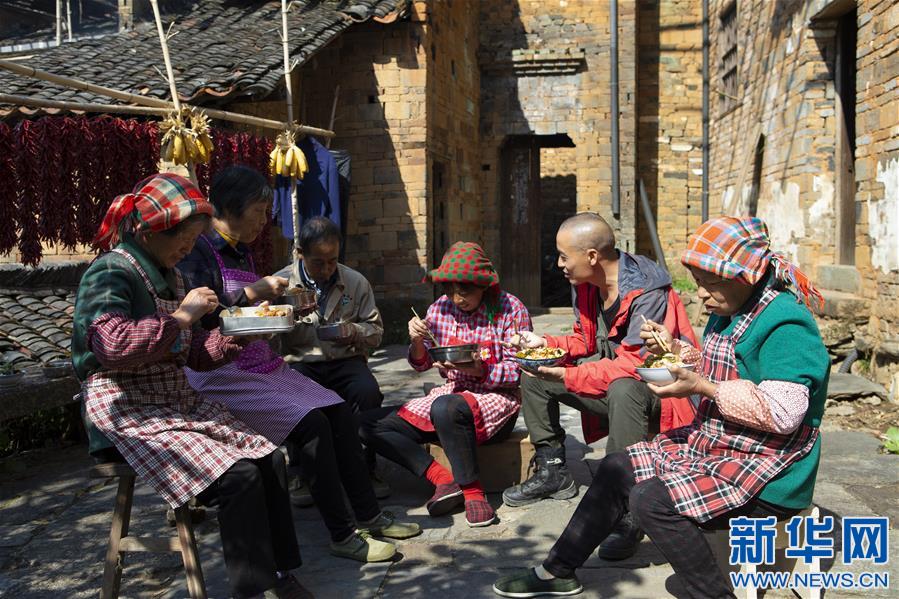 曹加祥(右二)和篁嶺景區(qū)的工作人員一起吃午飯(11月6日攝)。新華社記者張浩波攝