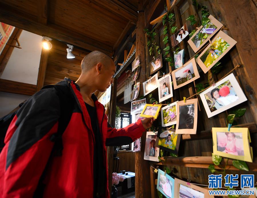 曹加祥在篁嶺村的攝影吧內欣賞其他游客拍攝的圖片(11月6日攝)。新華社記者胡晨歡攝