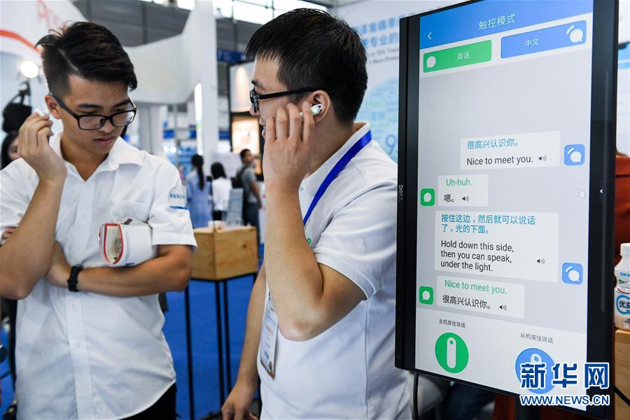 2018年11月16日,在深圳舉行的第20屆高交會上,來自深圳的年輕創(chuàng)客(右)向參觀者介紹團(tuán)隊(duì)研發(fā)的同聲傳譯耳機(jī)。 新華社記者 毛思倩 攝