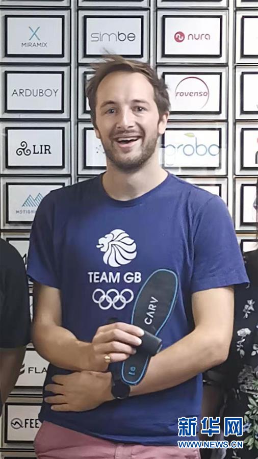 來自英國的創(chuàng)客杰米·索爾特展示自己研發(fā)的智能滑雪鞋墊(資料照片)。 新華社發(fā)