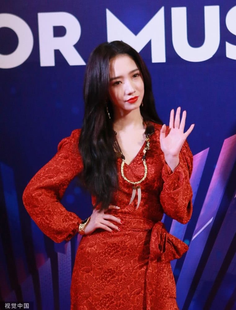 孟美岐身穿大紅色長裙搭配波浪卷發(fā),大走港風美艷動人。