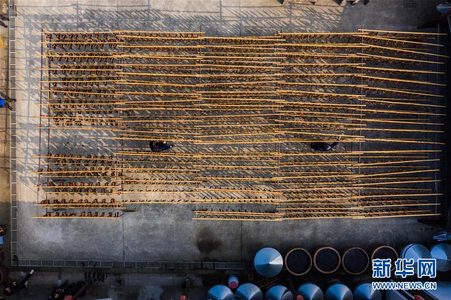 初冬時節(jié),浙江省紹興市柯橋區(qū)安昌古鎮(zhèn)開啟了傳統(tǒng)臘味制作、上市的季節(jié)。當(dāng)?shù)匕傩沼脗鹘y(tǒng)醬油、黃酒、香料等手工腌制臘腸、醬鴨、魚干、醬鵪鶉、醬排骨等紹興特色醬貨,在冬季的陽光下進(jìn)行晾曬,滿街飄香的臘味也成了這座江南古鎮(zhèn)的獨特風(fēng)景。安昌古鎮(zhèn)是浙江省歷史文化名鎮(zhèn),有著一千多年歷史,比較完善地保存了古吳越地區(qū)沿襲千百年來的民俗風(fēng)情。每年大雪節(jié)氣前后,安昌當(dāng)?shù)匕傩瞻凑諅鹘y(tǒng)習(xí)俗挑選晴朗好天氣制作、晾曬傳統(tǒng)醬貨,各類醬貨顏色黑紅油亮,咸鮮適口,是當(dāng)?shù)囟镜奶厣珎鹘y(tǒng)美食。新華社記者徐昱攝