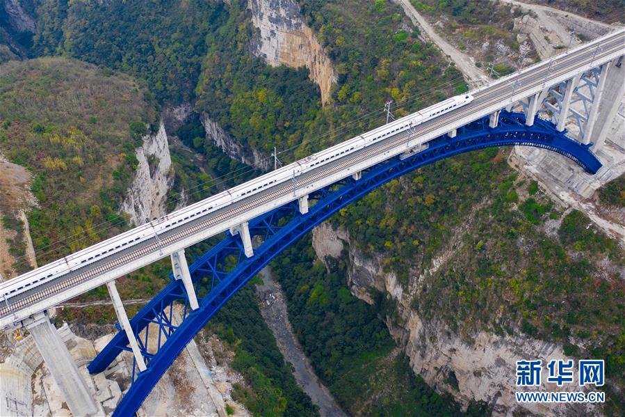 12月2日,一輛試驗(yàn)列車駛過成貴高鐵鴨池河特大橋。當(dāng)日,正在進(jìn)行聯(lián)調(diào)聯(lián)試的成貴高鐵進(jìn)入全線拉通空載模擬運(yùn)行階段,試驗(yàn)列車將在成都到貴陽區(qū)間內(nèi)全線路運(yùn)行。線路全長650公里的成貴高鐵是我國“八縱八橫”高速鐵路網(wǎng)的重要組成部分,設(shè)計(jì)時(shí)速為250公里。新華社記者劉續(xù)攝