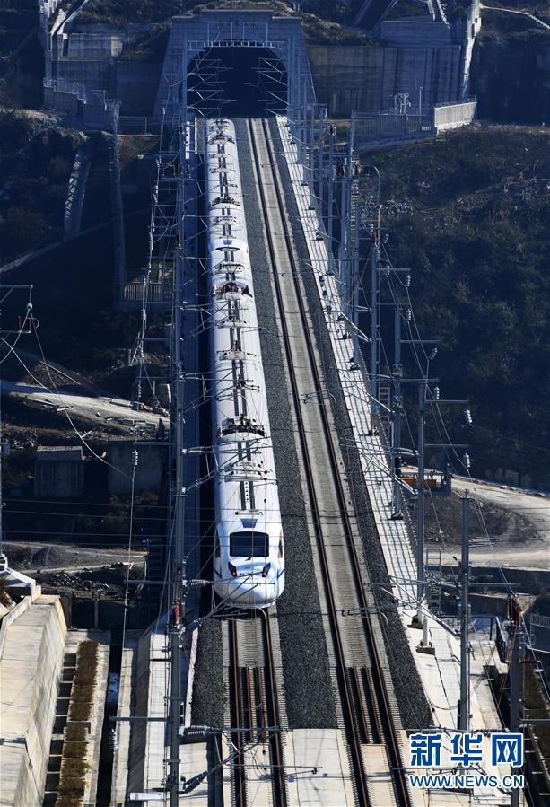 12月15日,一列試驗列車行駛在貴州清鎮(zhèn)市境內的成貴高鐵線上。成(都)貴(陽)高鐵預計于12月16日全線正式開通運營。成貴高鐵線路全長650公里,是我國“八縱八橫”高速鐵路網(wǎng)的重要組成部分,設計時速為250公里。新華社記者楊文斌攝