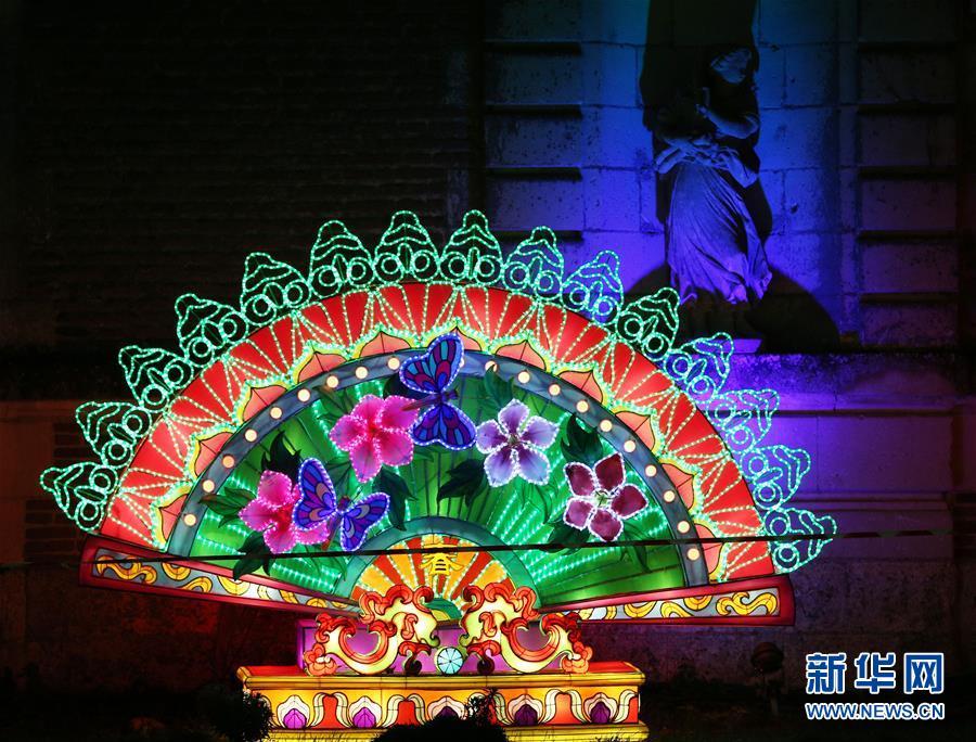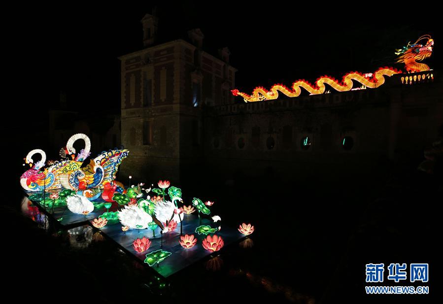 12月15日,在法國謝爾河畔塞勒市的塞納古堡,中國彩燈與城堡雕塑相得益彰。  新華社記者 高靜 攝